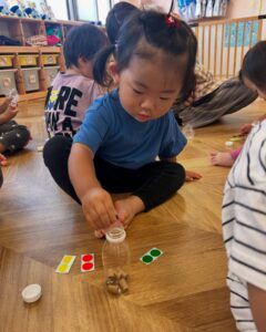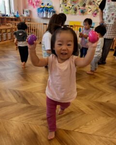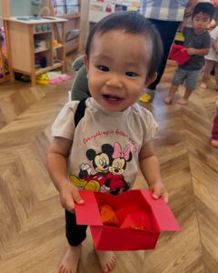 7回目の音育遊びでは、マイどんぐり入れを持って