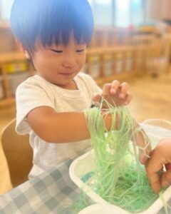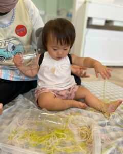 ヒンヤリ冷たくて、ムニュムニュの初めての感触に子ども達は「つめたーい」「ムニュムニュしてきた〜✨」o(>∀<*)o
